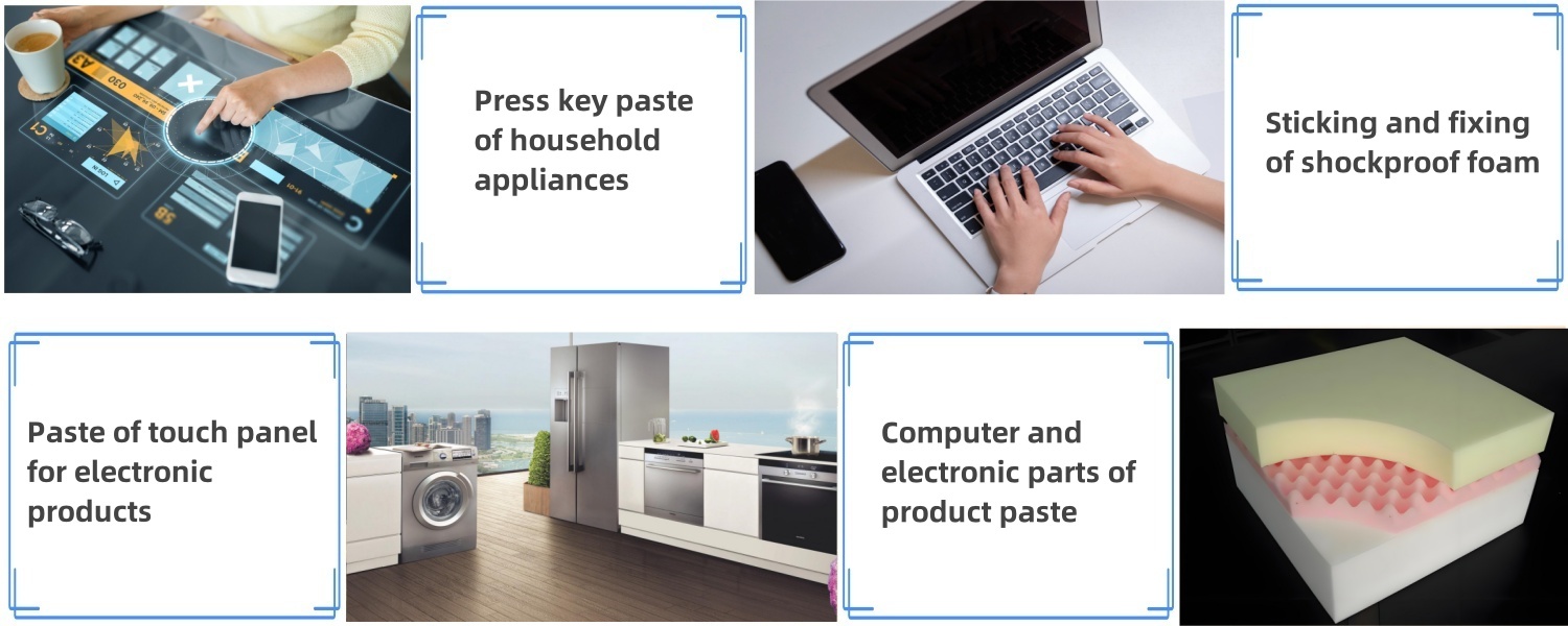 Metal sheets and nameplates bonding ; Suitable for small components of electronic products and phones ; Electrical appliance components and shockproof foam.